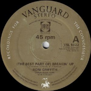 Roni Griffith - -The Best Part Of Breakin Up / Love Is The Drug Roni Griffith - -The Best Part Of Breakin Up / Love Is The Drug Tracklist: A -The Best Part Of Breakin Up 5:38 B Love Is The Drug 4:50 Companias, etc Manufactured By: PRT Records Ltd. Distributed By: PRT Records Ltd. Phonographic Copyright -p: Vanguard Recording Society, Inc. Published By: Carlin Music Corp. Published By: Jackaroe Music Publishers Published By: Bobby O Music Pressed By: Damont Códigos e identificadores Matrix / Runout: Side A runout groove, etched VSL 5022 A-1. DAMONT Matrix / Runout: Side B runout groove, etched VSL 5022 B-1 DAMONT Matrix / Runout: Side A label -VSL 5022 A Matrix / Runout: Side B label -VSL 5022 B Rights Society: -MCPS