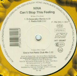 Nina - Cant Stop This Feeling Nina - Cant Stop This Feeling Tracklist: A1) Cant Stop This Feeling -Geos Hot Pants Club Mix 5:30 B1) Cant Stop This Feeling -D-Generator Remix 6:39 B2) Cant Stop This Feeling -Radio Edit 3:52 Companias, etc Phonographic Copyright -p: Intercord Tonträger GmbH Copyright -c: Intercord Tonträger GmbH Marketed By: Intercord Tonträger GmbH Remixed At: Paramusic Remixed At: Perky Park Music GmbH Published By: Kick Musik Códigos e identificadores Barcode: Text 0 724387 845169 Barcode: Scanned 0724387845169 Price Code: F PM 212 Price Code: I 014 Label Code: LC 8076 Rights Society: bel BIEM