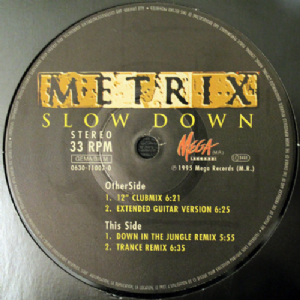 Metrix - Slow Down Metrix - Slow Down Tracklist: A1) Slow Down -12 Clubmix 6:21 A2) Slow Down -Extended Guitar Version 6:25 B1) Slow Down -Down In The Jungle Remix 5:55 B2) Slow Down -Trance Remix 6:35 Companias, etc Record Company: Mega Scandinavia A/S Phonographic Copyright -p: Mega Records Copyright -c: Mega Records Recorded At: Tuff Studios Mixed At: Tuff Studios Pressed By: WMME Alsdorf Códigos e identificadores Barcode: 7 06301 10070 7 Matrix / Runout: Side A WMME Alsdorf 063 011007-0-A Matrix / Runout: Side B WMME Alsdorf 063 011007-0-B Label Code: LC 3481 Rights Society: GEMA/BIEM