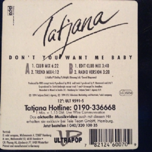 Tatjana - Dont You Want Me Baby Tatjana - Dont You Want Me Baby Tracklist: A1) Dont You Want Me Baby -Club Mix 6:22 A2) Dont You Want Me Baby -Trend Mix 4:12 B1) Dont You Want Me Baby -Edit Club Mix 3:40 B2) Dont You Want Me Baby -Radio Version 3:20 Companias, etc Phonographic Copyright -p: Tatjana Simics Agency B.V. Recorded At: Studio 33 Códigos e identificadores Barcode: 7 82124 60070 9