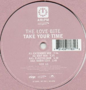 The Love Bite - Take Your Time / Illicit Vocal Mix The Love Bite - Take Your Time / Illicit Vocal Mix Tracklist: A) Take Your Time -Illicit Vocal Mix 6:59 B) Take Your Time -Illicit Dub 5:59 Companias, etc Phonographic Copyright -p: Rise Phonographic Copyright -p: TIME S.r.l. Copyright -c: Zeitgeist Copyright -c: Polydor Zeitgeist Licensed From: TIME S.r.l. Mastered At: Optimal Media Production Published By: Sym Music Recorded At: Niceplace Studio Produced For: Illicit Productions Designed At: Marc Schilkowski Códigos e identificadores Barcode: Text 7 31458 77821 9 Barcode: Scanned 731458778219 Matrix / Runout: Stamped Runout A B037418-01 A1 MK Matrix / Runout: Stamped Runout B B037418-01 B1 MK Rights Society: BIEM/MCPS Label Code: LC 10432